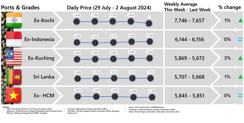 - Producers\' prices ex Lampung and Pangkal Pinang are average prices received by farmers for unprocessed pepper