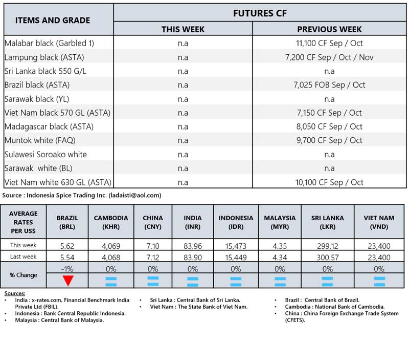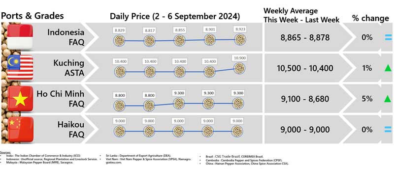 - Producers\' prices ex Lampung and Pangkal Pinang are average prices received by farmers for unprocessed pepper