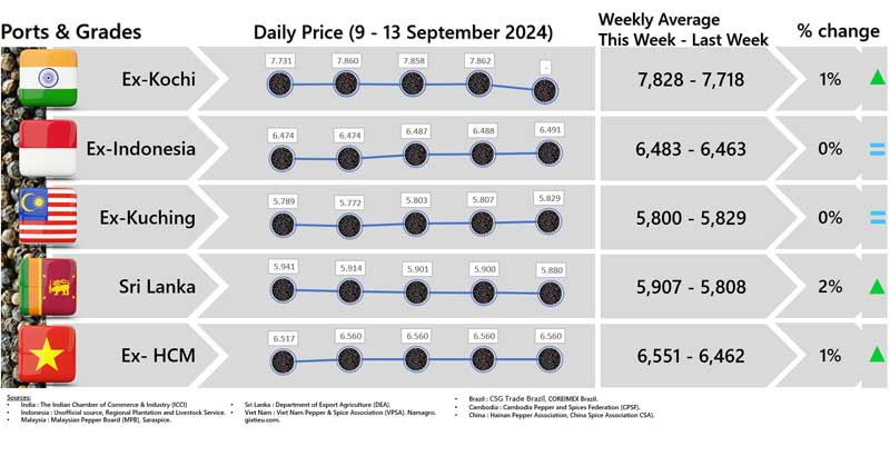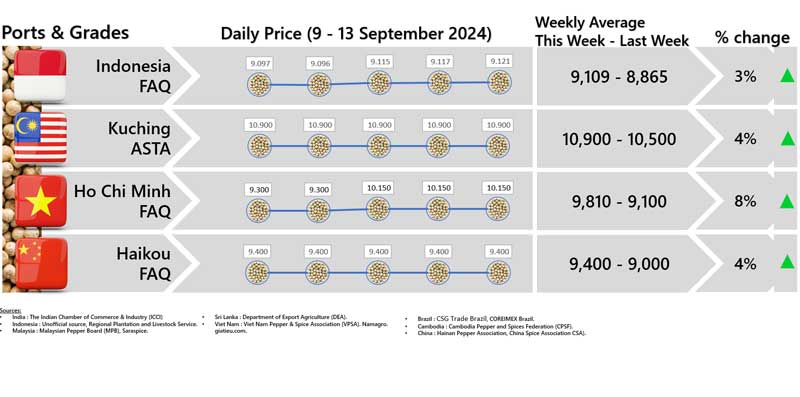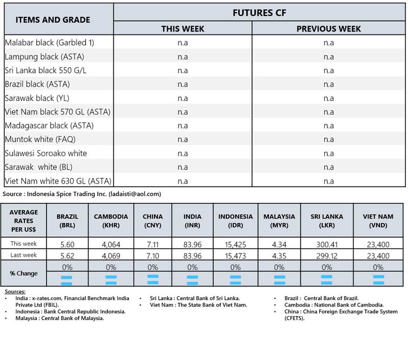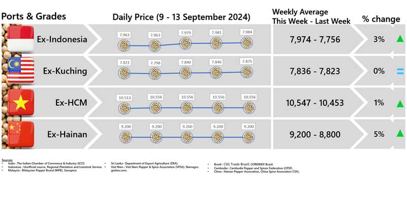 - Producers\' prices ex Lampung and Pangkal Pinang are average prices received by farmers for unprocessed pepper
