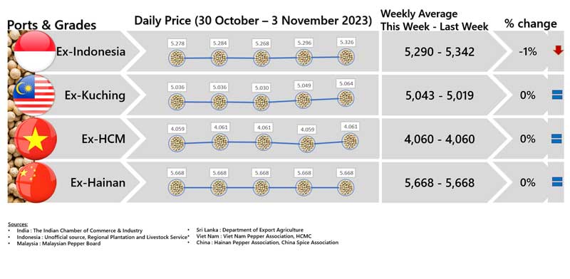 - Producers\' price ex Ho Chi Minh City is prices for local purchases of pepper (500 g/l for black and 630g/l for white)