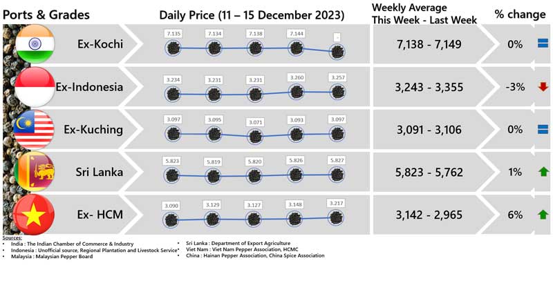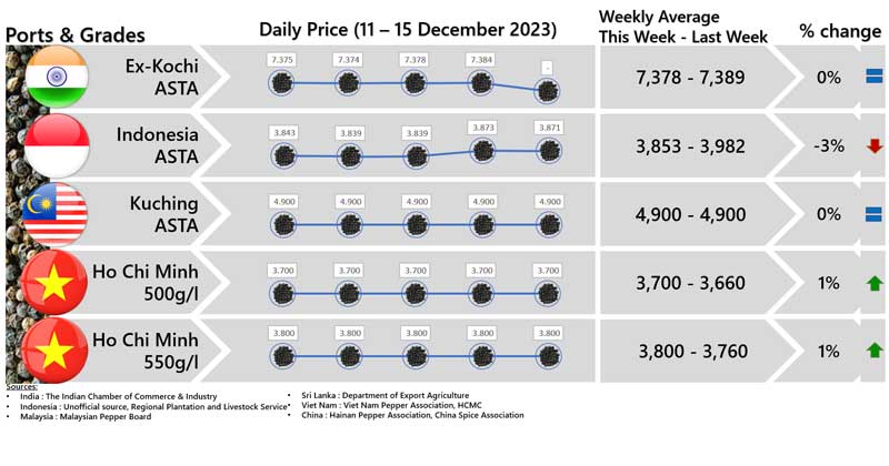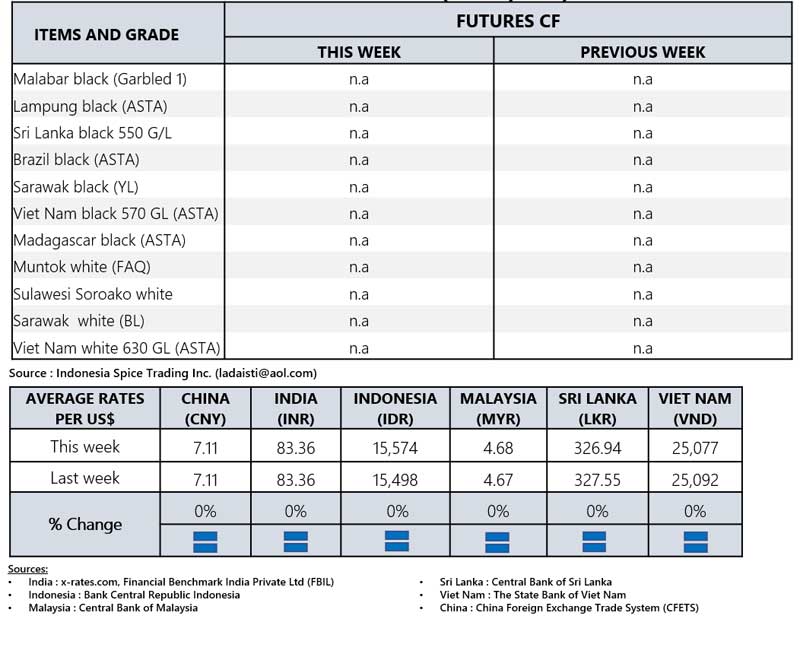 - Producers\' prices ex Lampung and Pangkal Pinang are average prices received by farmers for unprocessed pepper