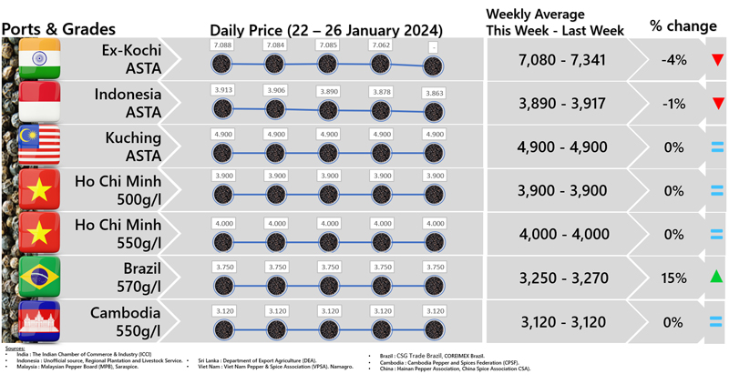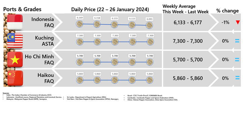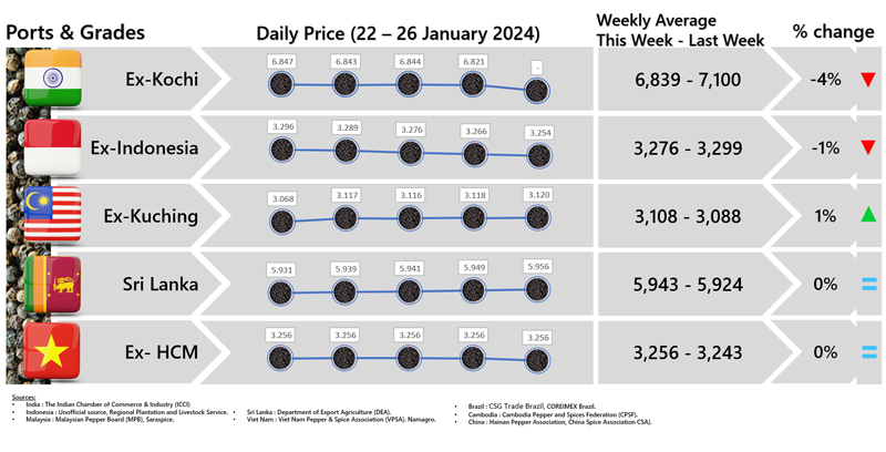 - Producers\\\' price ex Ho Chi Minh City is prices for local purchases of pepper (500 g/l for black and 630g/l for white)