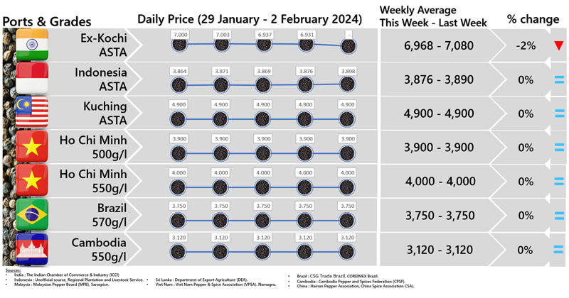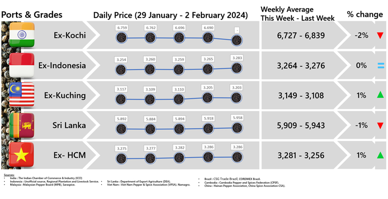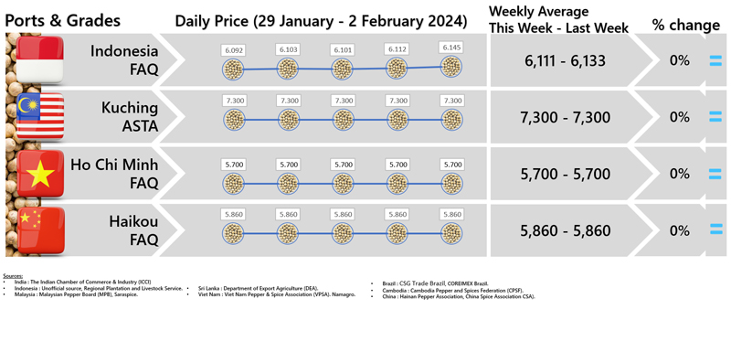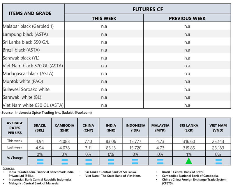 - Producers\' prices ex Lampung and Pangkal Pinang are average prices received by farmers for unprocessed pepper