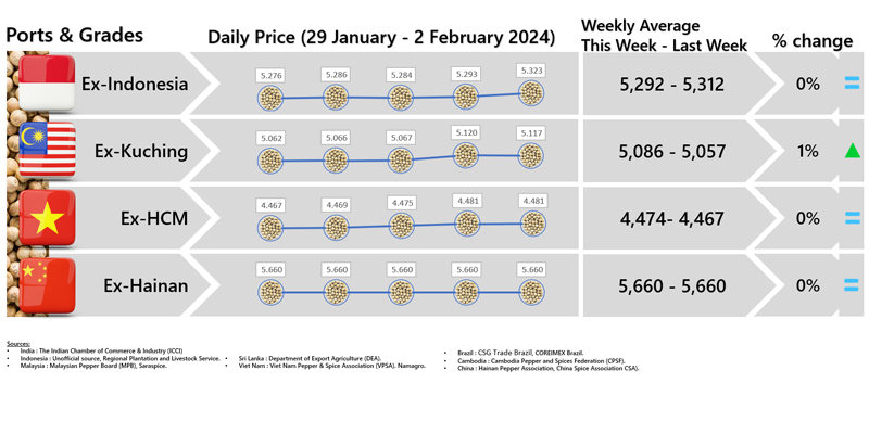 - Producers\' prices ex Kuching are the average prices offered by local traders to farmers for unprocessed pepper - grade 1