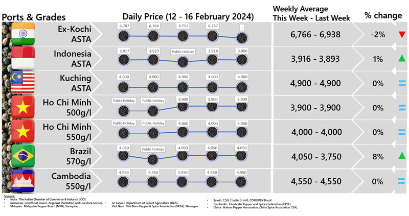 - Producers' price ex Ho Chi Minh City is prices for local purchases of pepper (500 g/l for black and 630g/l for white)