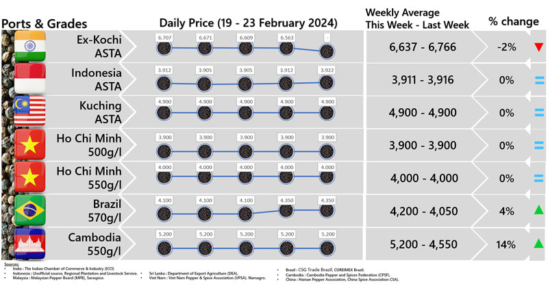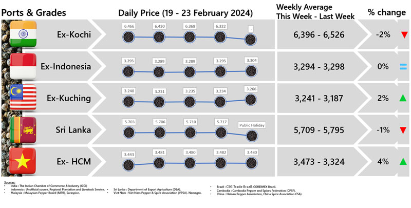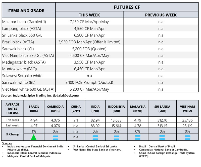 - Producers' prices ex Lampung and Pangkal Pinang are average prices received by farmers for unprocessed pepper