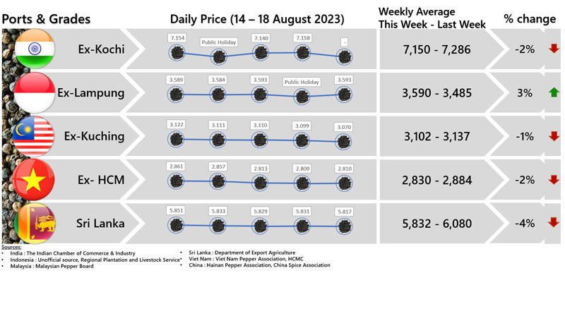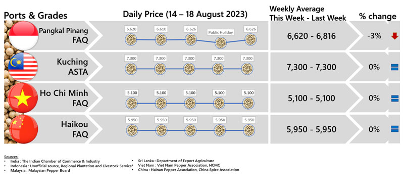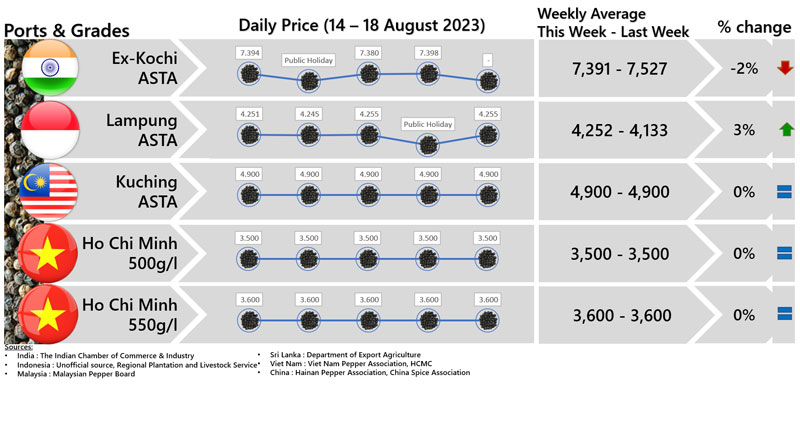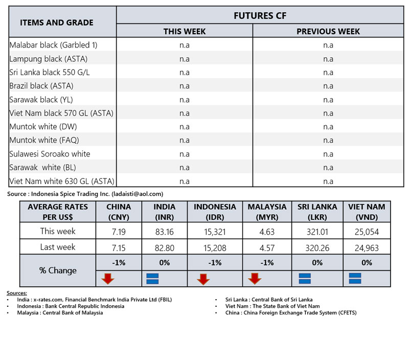- Producers\' prices ex Lampung and Pangkal Pinang are average prices received by farmers for unprocessed pepper