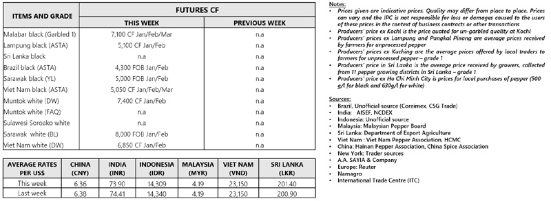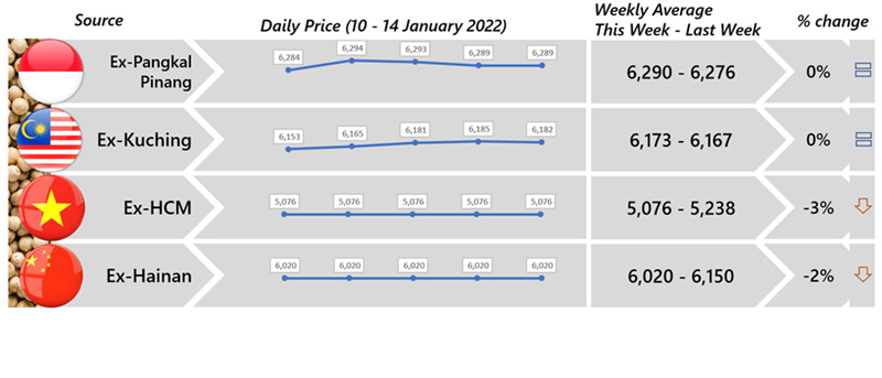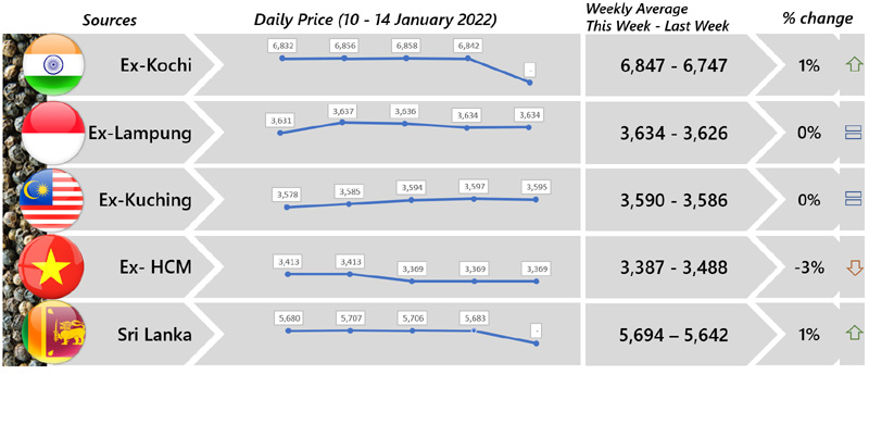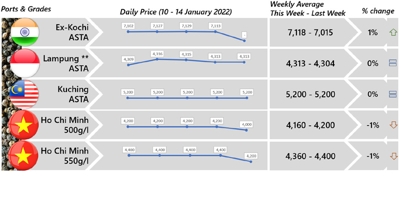 | 07 | USA - Market was reported more less unchanged as compared to the last two weeks as limited trading activity in the beginning of 2022. Furthermore, traders/trading houses were busy for all tenders and warehouse inventory as well as window shopping. Muntok White Pepper was reported at USD 7,400 CF Jan/Feb. |