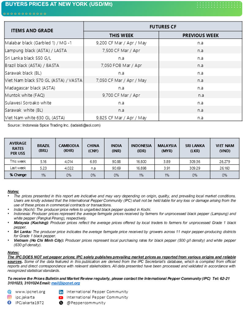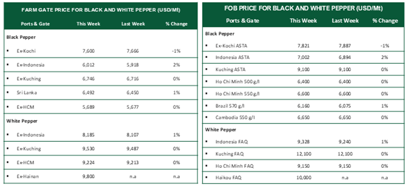 Brazil recorded firmer black pepper prices over the week, while black pepper prices in Cambodia and white pepper prices in China remained largely steady, reflecting stable pepper market conditions in those origins.