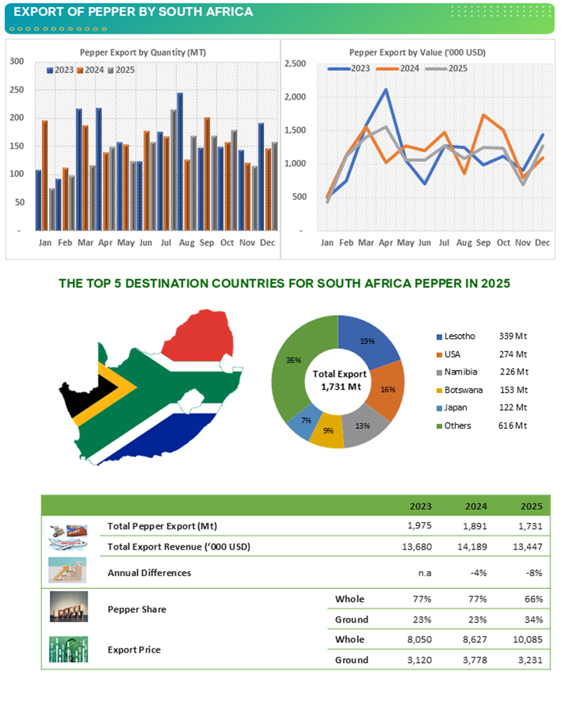 For the 2025 period, South Africa exported 1,731 metric tonnes of pepper. Lesotho remained the principal destination for South African pepper, absorbing 339 metric tonnes, followed by the United States, Namibia, Botswana, and Japan, demonstrating a diversified and resilient pepper export structure.