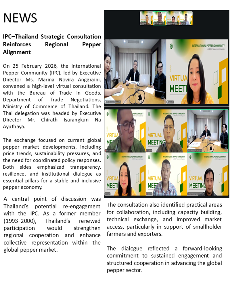 During the final week of February, the global pepper market maintained a broadly firm tone, with price movements differing across major producing origins. The U.S. pepper market remained stable, while overall global pepper trading activity continued at a measured and orderly pace.